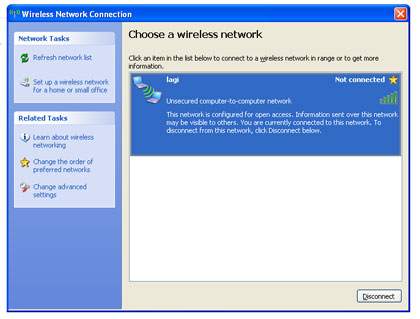 Nah, sekarang anda telah berhasil membuat Ad Hoc Access point untuk satu notebook anda. Hore...selamat...selamat !! Anda hebat !! Sukses yaa ! Udah yah...saya ngantuk...besok dilanjutkan lagi ! Daaah. Oh iya, sebagai tanda setting wifi anda berhasil maka, di bagian Wireless Network Connection akan muncul sebuah access point buatan anda !